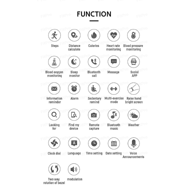 - Function:chronograph, Lighting, Calendar, Alarm Clock, Week, MONTH, WORLD TIME, Remote Control, Countdown, Noctilucent, Sleep Tracker, Speed Measurement, Fitness Tracker, Call Reminder, Answer Call, Push Message, Message Reminder, Dial Call, Heart Rate Tracker, Interactive Music, 24 hour instruction, Blood oxygen monitor, NFC.